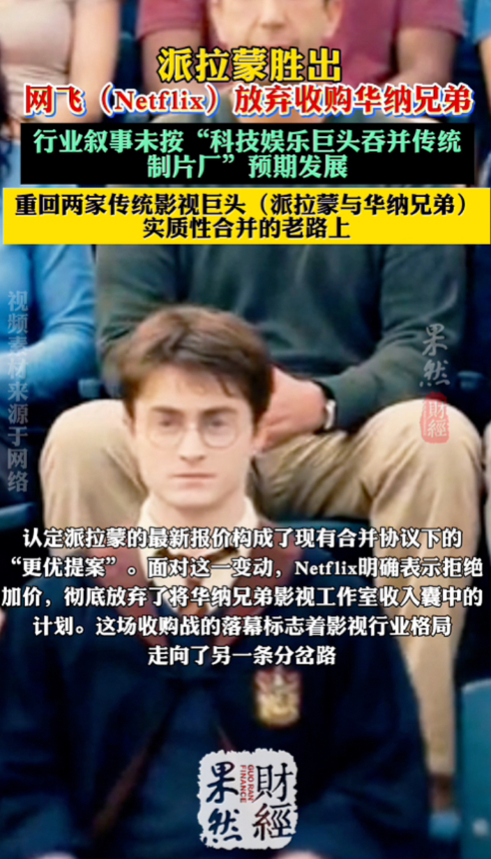 果然财经|派拉蒙胜出,Netflix放弃收购华纳兄弟齐鲁壹点 | 昨天22:40 原创齐鲁晚报·齐鲁壹点客户端 微信扫码扫码下载客户端Netflix 2月26日发布公告,放弃收购华纳兄弟探索公司(WBD)及其旗下HBO的计划。据凤凰网科技,Netflix 曾于 去年底以827亿美元(约合5682.68亿元人民币)的报价击败派拉蒙一度有望成为WBD的新东家。不过,随着竞争对手持续施压,这场备受瞩目的世纪收购案最终宣告破裂。