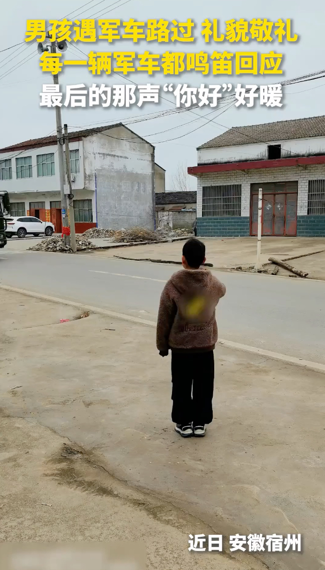 近日,安徽宿州,男孩在家门口遇军车路过,礼貌敬礼。每一辆军车都鸣笛回应,最后的那声“你好”,好暖!