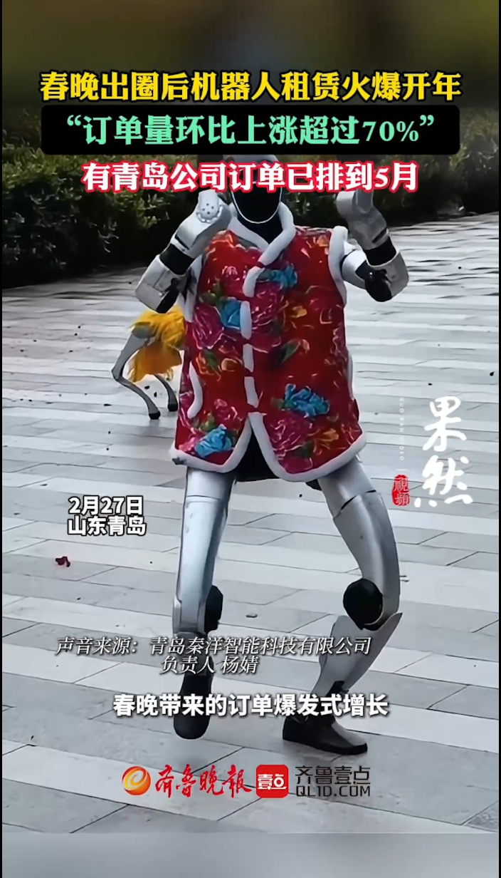 果然视频丨春晚出圈后机器人租赁火爆!有青岛公司订单已排到5月齐鲁晚报·齐鲁壹点客户端 10:31原创2月27日,记者走访青岛机器人租赁市场了解到,春节假期后,机器人租赁市场火爆,有公司订单量环比上涨超70%,租赁排期已预订到5月份。(齐鲁晚报·齐鲁壹点 杨雪 刁明杰)