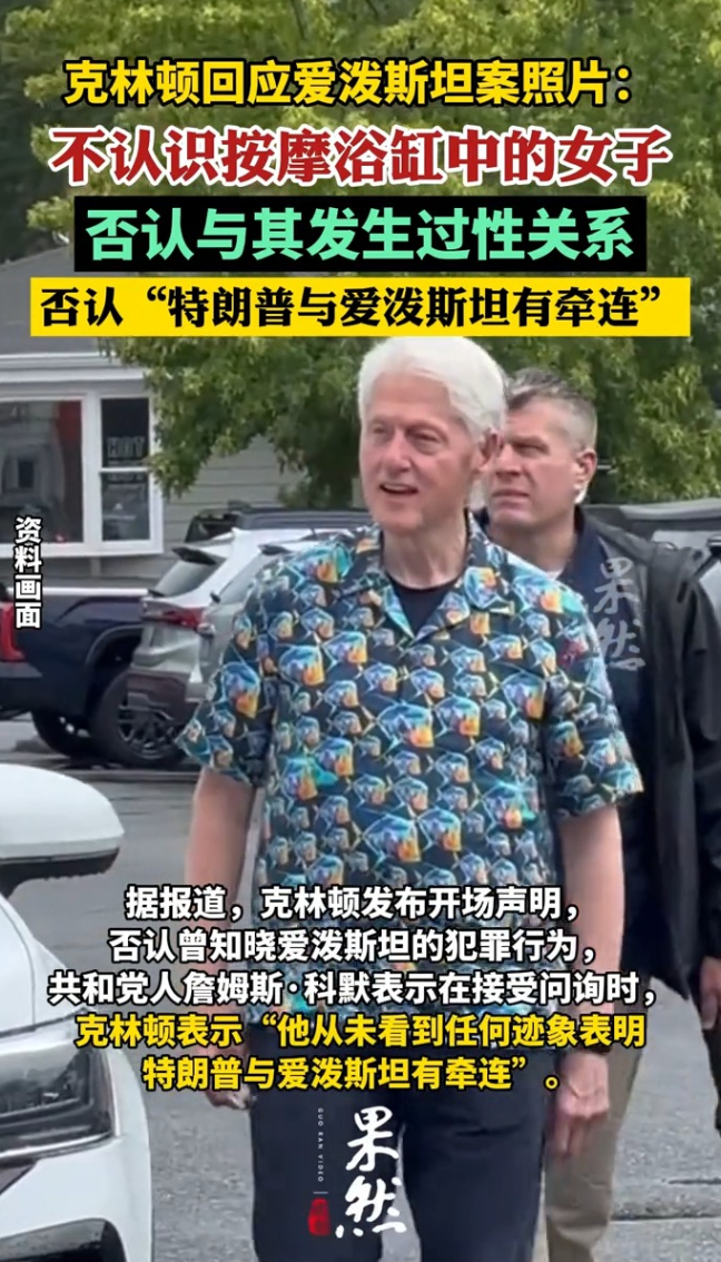 克林顿回应爱泼斯坦案照片:不认识按摩浴缸中的女子,否认与其发生过性关系