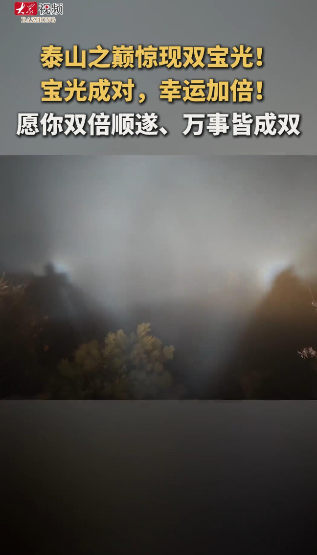 泰山顶惊现双宝光!宝光成对,幸运加倍!愿你双倍顺遂、万事皆成双大众新闻 11:20原创2月27日,晨雾中,泰山之巅惊现双宝光!愿你双倍顺遂、万事皆成双!(大众新闻记者 王洪涛 制作 王珂 通讯员 赵建东)(大众日报及大众新闻客户端欢迎各界投稿,提供线索,包括文字、照片、短视频,文字投稿务必配上照片、短视频。泰安新闻素材请投大众日报泰安记者站电子邮箱dzrbta@126.com,热线电话:05388011909。来稿请务必注明作者、手机,以便进一步联系。)
