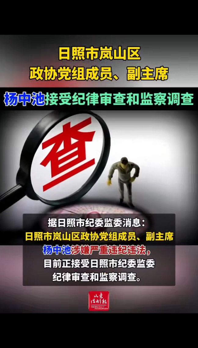 日照市岚山区政协党组成员、副主席杨中池接受纪律审查和监察调查山东法制报 | 17:20 现场山东省纪委监委网站 微信扫码扫码下载客户端据日照市纪委监委消息:日照市岚山区政协党组成员、副主席杨中池涉嫌严重违纪违法,目前正接受日照市纪委监委纪律审查和监察调查。