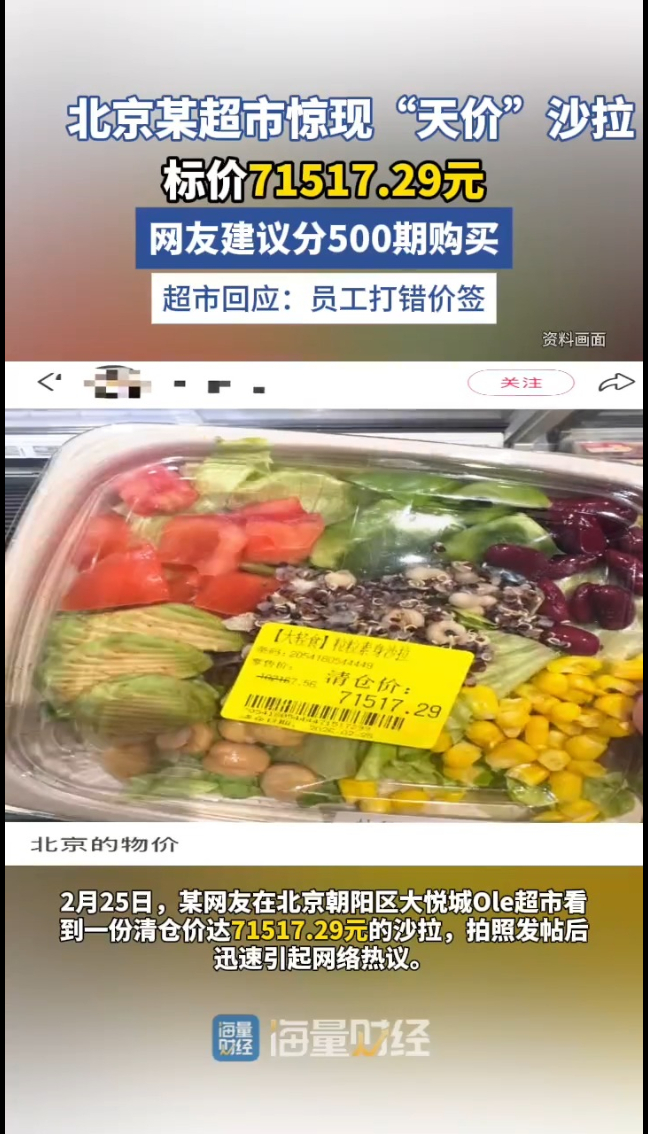 2月25日,有网友在北京市朝阳区大悦城Olé精品超市看到一份标价为71517.29元的沙拉,拍照发帖后迅速引起网络热议。