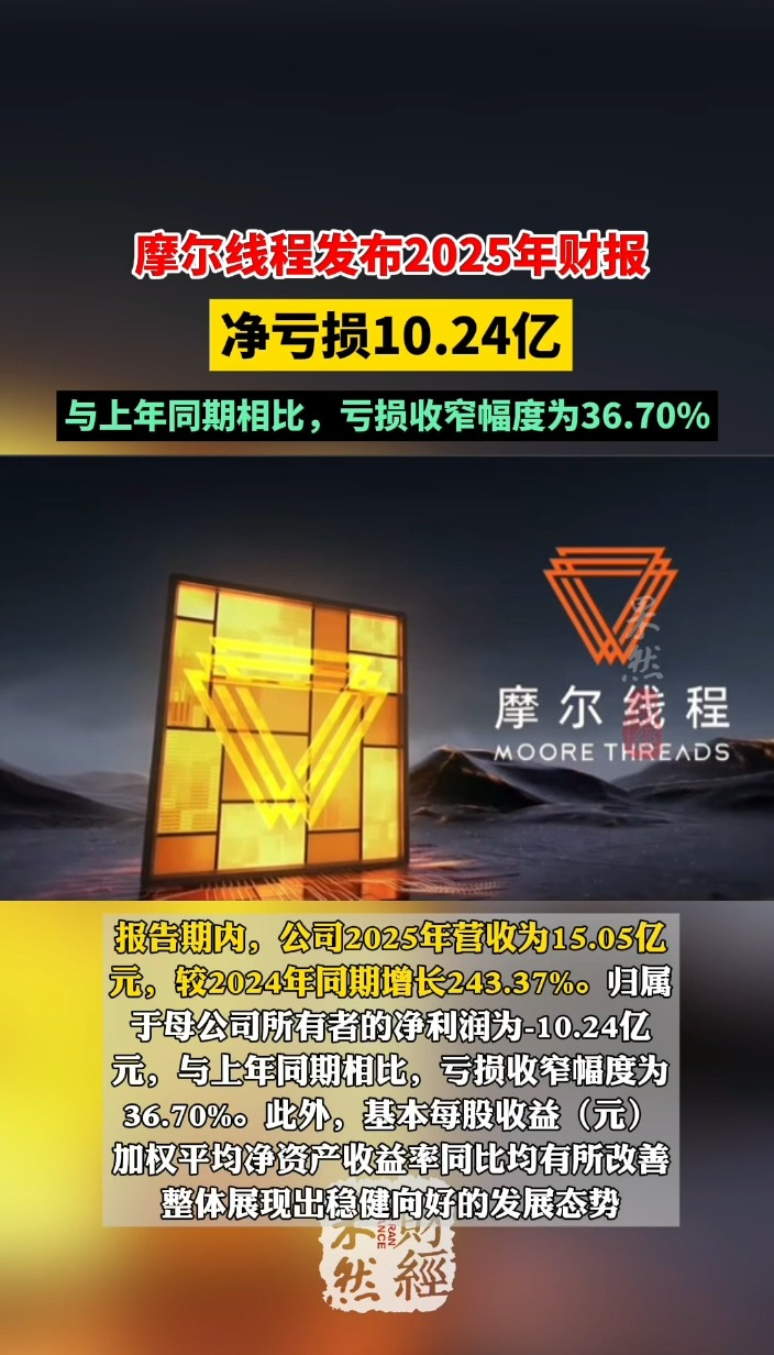 果然财经|摩尔线程发布2025年财报,净亏损10.24亿 17:11 原创齐鲁晚报·齐鲁壹点客户端 微信扫码扫码下载客户端2月27日,摩尔线程智能科技(北京)股份有限公司(证券代码:688795)发布《2025年度业绩快报》,报告期内,公司2025年营收为15.05亿元,较2024年同期增长243.37%。归属于母公司所有者的净利润为-10.24亿元,与上年同期相比,亏损收窄幅度为36.70%。