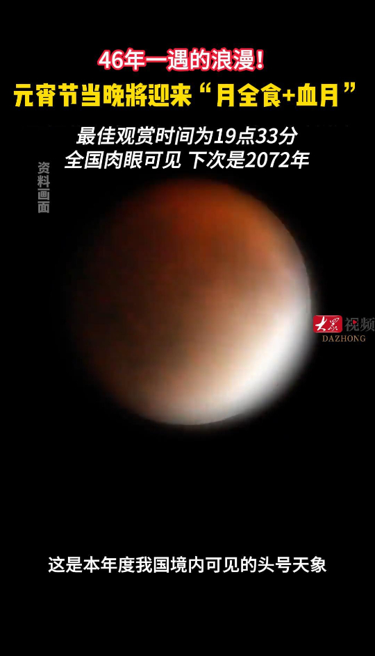 46年一遇的浪漫!元宵节当晚将迎来血月+月全食,最佳观赏时间19点33分大众新闻 19:39原创元宵佳节将至,一场月全食将在当晚上演。北京天文馆专家表示,这是本年度我国境内可见的头号天象,非常值得期待。(大众新闻记者 徐付彪)