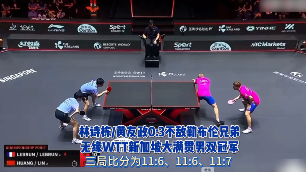 果然视频|林诗栋/黄友政不敌勒布伦兄弟,无缘新加坡大满贯冠军齐鲁壹点 | 昨天23:33 原创齐鲁晚报·齐鲁壹点客户端 微信扫码扫码下载客户端2月28日晚,WTT新加坡大满贯男双决赛,林诗栋/黄友政0:3不敌勒布伦兄弟,屈居亚军。(齐鲁晚报·齐鲁壹点 怀晓)