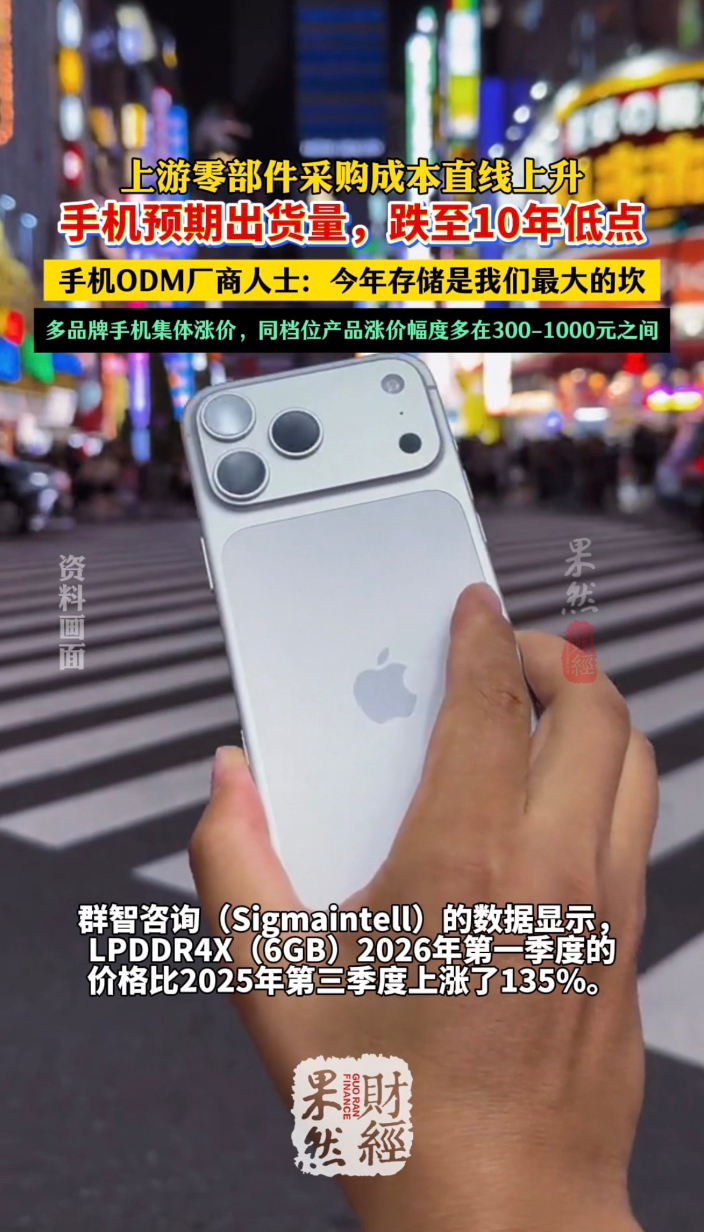 果然财经|内存涨价!手机预期出货量,跌至10年来最低点齐鲁壹点 | 08:16 原创齐鲁晚报·齐鲁壹点客户端 微信扫码扫码下载客户端上游零部件的采购成本直线上升正在改变整个消费电子行业的逻辑。日前,两家知名分析机构均下调了2026年的消费电子出货预期。根据市场研究公司Gartner的最新预测,2026年全球个人电脑出货量预计下滑10.4%,智能手机出货量预计下降8.4%,双双跌至过去十年的最低水平。