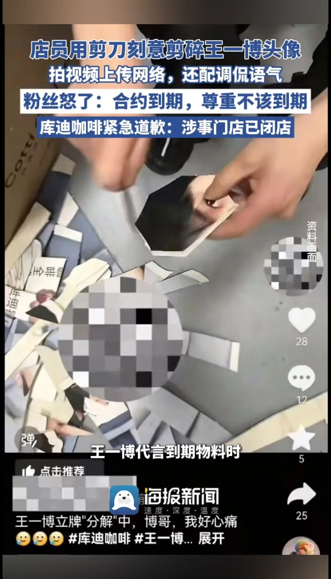 库迪咖啡这回摊上事了!有门店员工在处理王一博代言到期物料时,用剪刀刻意剪碎王一博头像,还拍视频上传网络,配着调侃语气发到网上。网友认为:“用剪刀刻意剪碎王一博头像并拍摄传播,这种行为既不专业也不尊重人”。