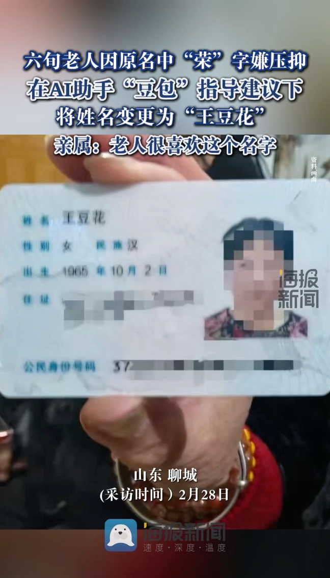 六旬老人在AI助手“豆包”指导建议下将姓名变更为“王豆花”,亲属:老人很喜欢这个名字