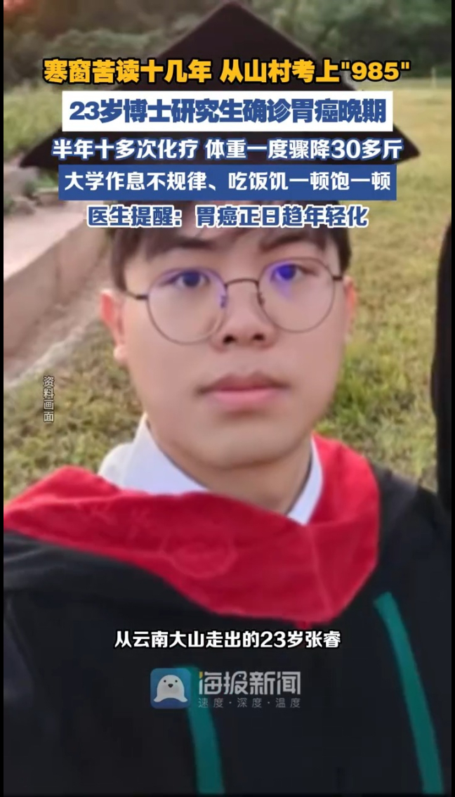 别再熬夜、吃饭饥一顿饱一顿了!从云南大山走出的23岁张睿,拼搏16年圆梦中山大学博士研究生,却在研一下学期确诊胃癌晚期。他曾因专注学习,忽视了胃胀、进食困难的身体信号,腰痛初诊还被怀疑是肾结石,最终查出癌细胞多发转移。大半年里,他接受了十多次化疗,体重一度骤降30多斤,所幸目前病情暂趋稳定。张睿坦言,大学作息饮食不规律,再加上家族病史,可能是患病诱因。医生提醒,胃癌正日趋年轻化,规律作息、健康饮食至关重要。