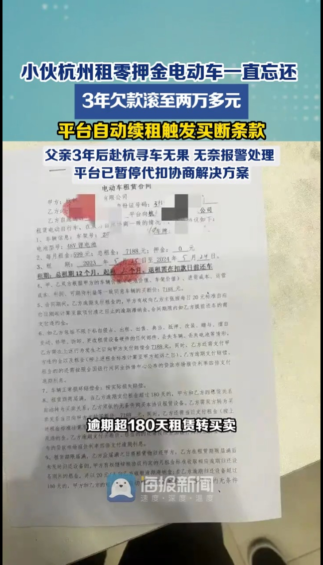 主播说 | 小伙杭州租零押金电动车一直忘还,3年欠款滚至两万多元
