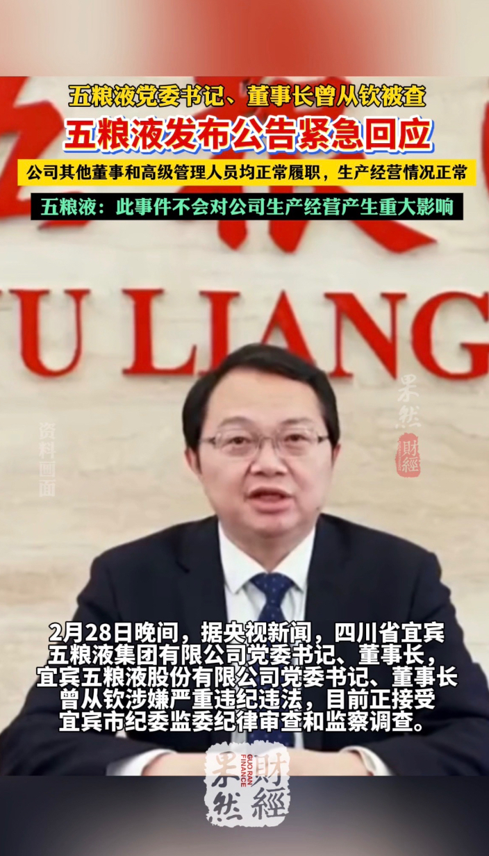 果然财经|五粮液党委书记曾从钦被查!五粮液发公告紧急回应 16:01 原创齐鲁晚报·齐鲁壹点客户端 微信扫码扫码下载客户端2月28日晚间,据央视新闻,四川省宜宾五粮液集团有限公司党委书记、董事长,宜宾五粮液股份有限公司党委书记、董事长曾从钦涉嫌严重违纪违法,目前正接受宜宾市纪委监委纪律审查和监察调查。随后,五粮液紧急发布宜宾五粮液股份有限公司关于董事长被留置的公告。