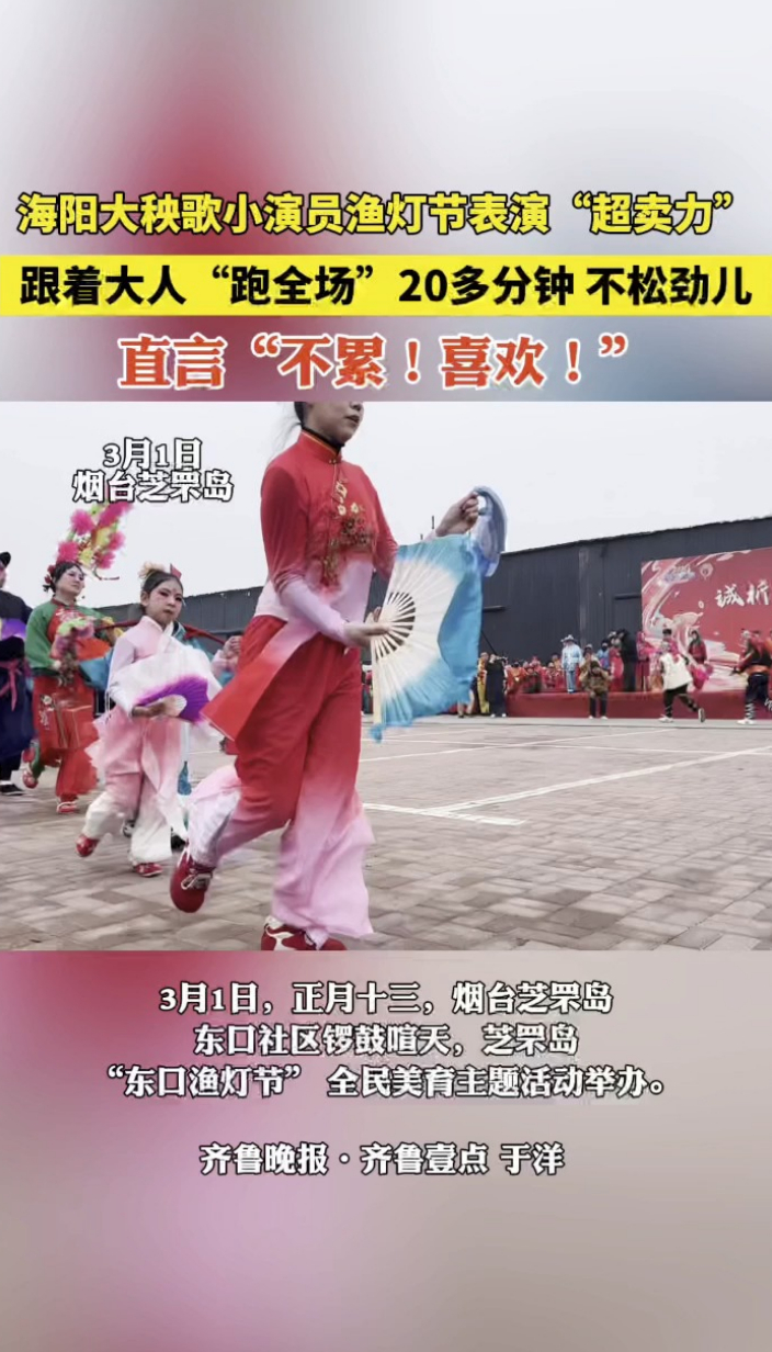 果然视频|渔灯节表演上,海阳大秧歌小演员“超卖力”跑全场齐鲁晚报·齐鲁壹点客户端 09:28原创3月1日,正月十三,烟台芝罘岛“东口渔灯节” 全民美育主题活动举办。海阳大秧歌小演员表演“超卖力”,跟着大人“跑全场”20多分钟不松劲儿,直言“不累!喜欢!”(齐鲁晚报·齐鲁壹点 于洋)