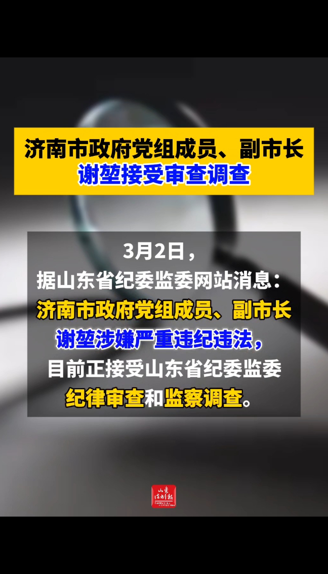 济南市政府党组成员、副市长谢堃接受审查调查 14:47 大众新闻·山东法制报 微信扫码扫码下载客户端3月2日,据山东省纪委监委网站消息:济南市政府党组成员、副市长谢堃涉嫌严重违纪违法,目前正接受山东省纪委监委纪律审查和监察调查。