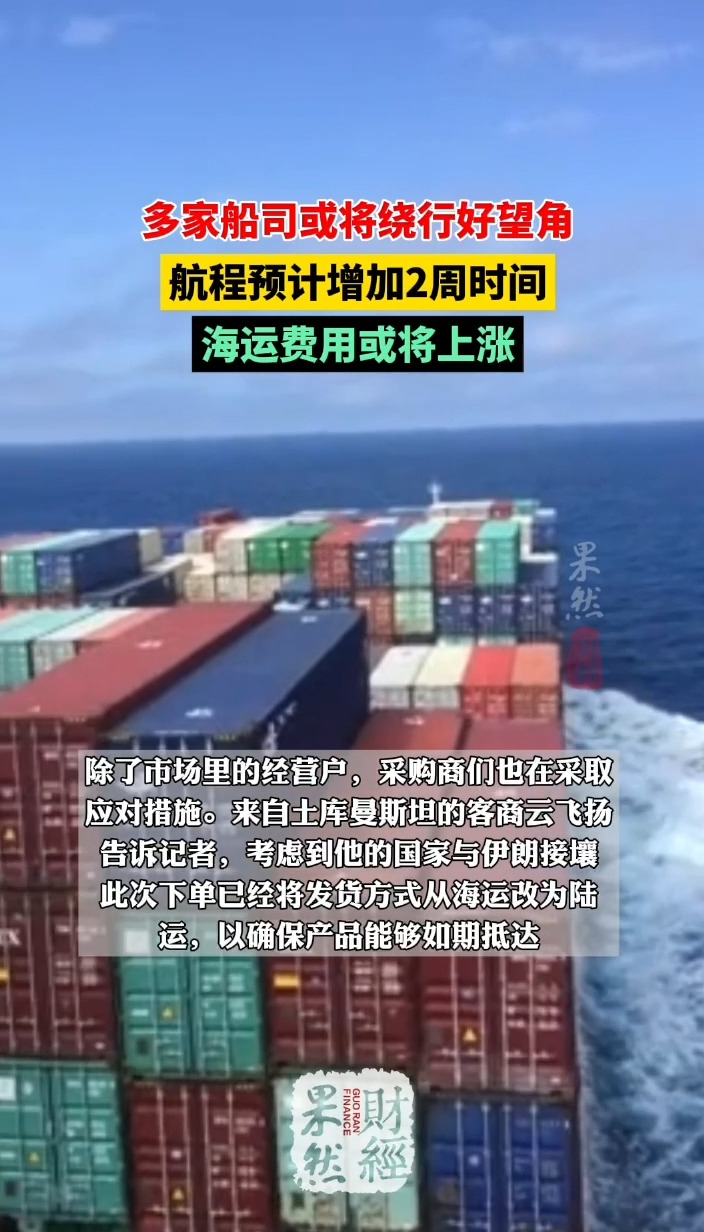果然财经|海运费用或将上涨,多家船司或将绕行好望角齐鲁壹点 | 11:41 原创齐鲁晚报·齐鲁壹点客户端 微信扫码扫码下载客户端据央视财经报道,受中东局势影响,发往中东地区的产品交期开始变得不太稳定。有货代人士向记者表示,受中东局势影响,很多船公司大概率也会选择经好望角绕行,航程预计增加2周时间,海运费用也将出现上涨的现象。为此,他们也在为企业规划替代方案。