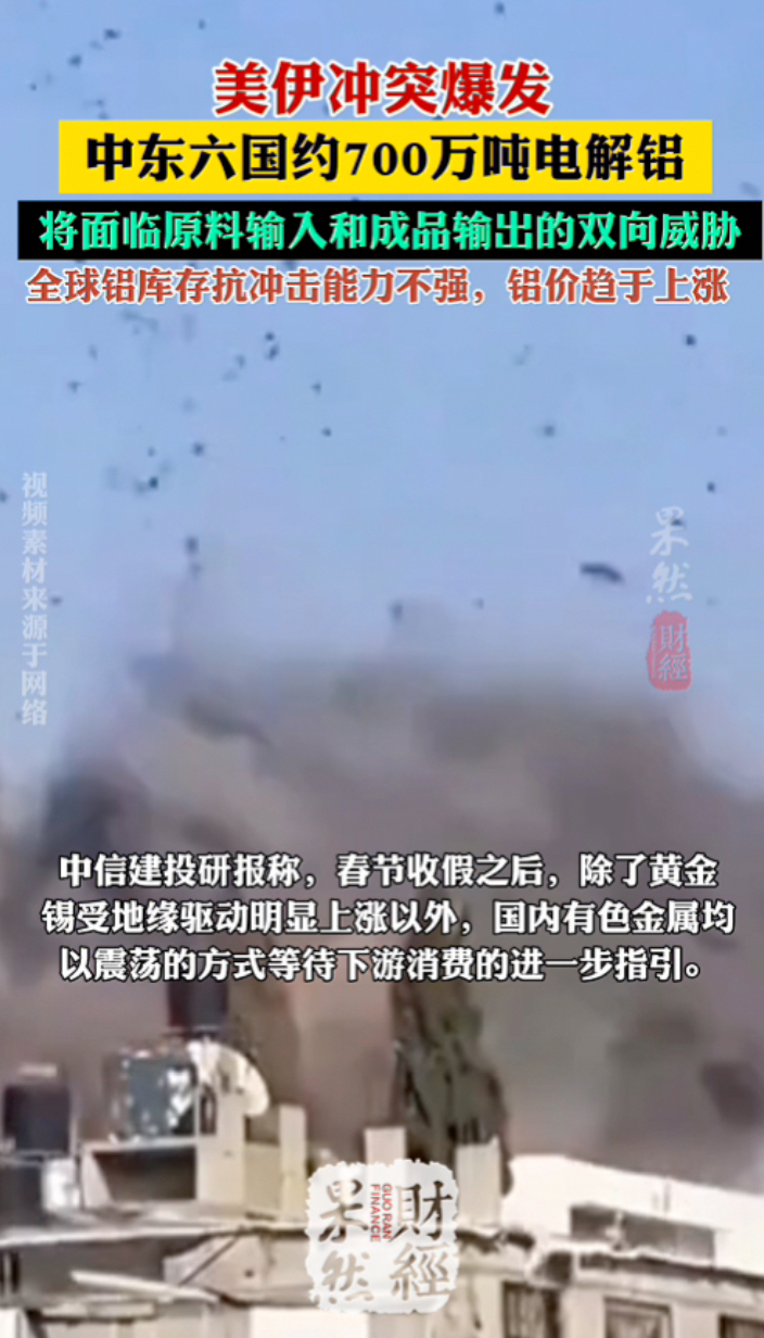 果然财经|美伊冲突爆发,中东约700万吨电解铝将面临双向威胁齐鲁壹点 | 11:40 原创齐鲁晚报·齐鲁壹点客户端 微信扫码扫码下载客户端中信建投研报称,春节收假之后,除了黄金、锡受地缘驱动明显上涨以外,国内有色金属均以震荡的方式等待下游消费的进一步指引。一方面,下游在正月十五之后陆续回归,库存拐点将清晰;另一方面,美伊冲突爆发,避险情绪有望推动贵金属价格继续上行,而中东六国约700万吨电解铝,特别是伊朗近80万吨电解铝将面临原料输入和成品输出的双向威胁。