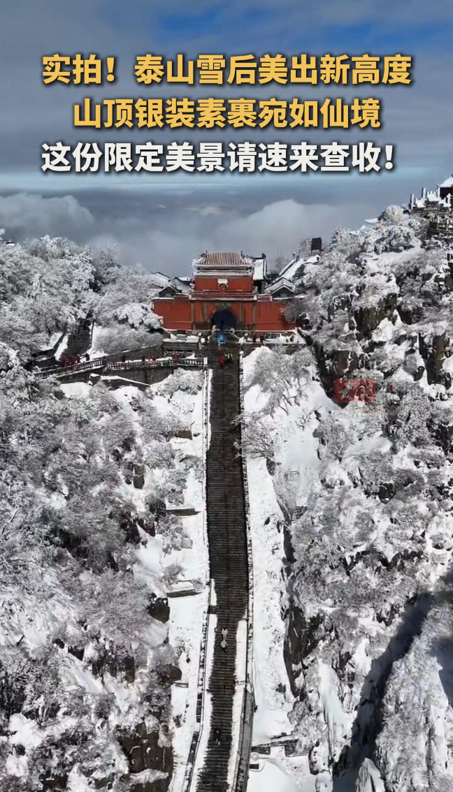 实拍!泰山雪后美出新高度!山顶银装素裹宛如仙境,这份限定美景请速来查收!大众新闻 11:55原创3月2日,泰山雪后放晴,银装素裹遇上翻涌云海,美成人间仙境!(大众新闻记者 王洪涛 制作 王珂 通讯员 付加志 刘春莲 王建)(大众日报及大众新闻客户端欢迎各界投稿,提供线索,包括文字、照片、短视频,文字投稿务必配上照片、短视频。泰安新闻素材请投大众日报泰安记者站电子邮箱dzrbta@126.com,热线电话:05388011909。来稿请务必注明作者、手机,以便进一步联系。)