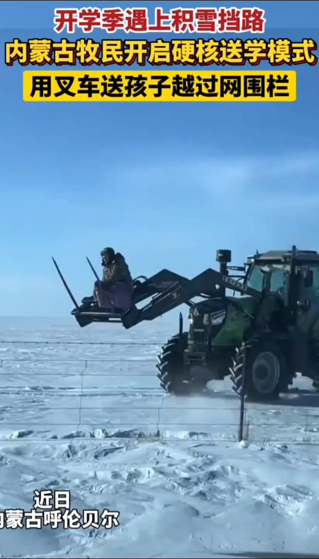 开学季遇上积雪挡路,内蒙古牧民开启硬核送学模式,用叉车送孩子越过网围栏