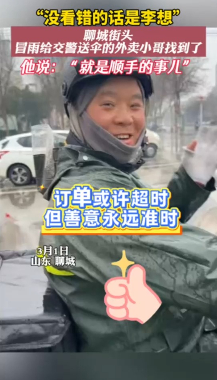 两河暖镜头|交警雨中执勤,骑手折返送伞,全城寻人,找到他了!大众报业·齐鲁壹点 13:143月1日清晨,聊城茌平城区雨雪潇潇。在文昌街与汇鑫路路口,一名外卖骑手看到冒雨执勤、浑身湿透的交警,立即停车买伞,将伞塞到交警手中后匆匆离去。这一暖心一幕经聊城警方寻人后刷屏朋友圈。经全城接力寻找,这位骑手被找到——他叫李想,1988年出生,茌平区韩屯镇人,是美团外卖的一名骑手。面对警方的致谢,李想腼腆回应:“就是顺手的事儿。”(齐鲁晚报·齐鲁壹点 陶春燕 通讯员 付延涛 郭新)