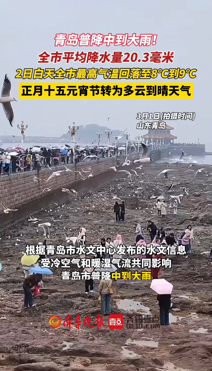 果然视频丨全市普降中到大雨!3月2日上午,青岛降雨逐渐结束齐鲁晚报·齐鲁壹点客户端 15:48原创自3月1日凌晨起,青岛市迎来一轮降雨过程。根据青岛市水文中心发布的水文信息,受冷空气和暖湿气流共同影响,青岛市普降中到大雨,3月1日8时至2日8时,全市平均降水量20.3 毫米,最大点崂山北九水39.1 毫米。2日上午,降雨逐渐结束。2日全市最高气温将回落至8℃到9℃。正月十五元宵节,青岛市将转为多云到晴的天气,气温变化不大。 (齐鲁晚报·齐鲁壹点 高雅洁)