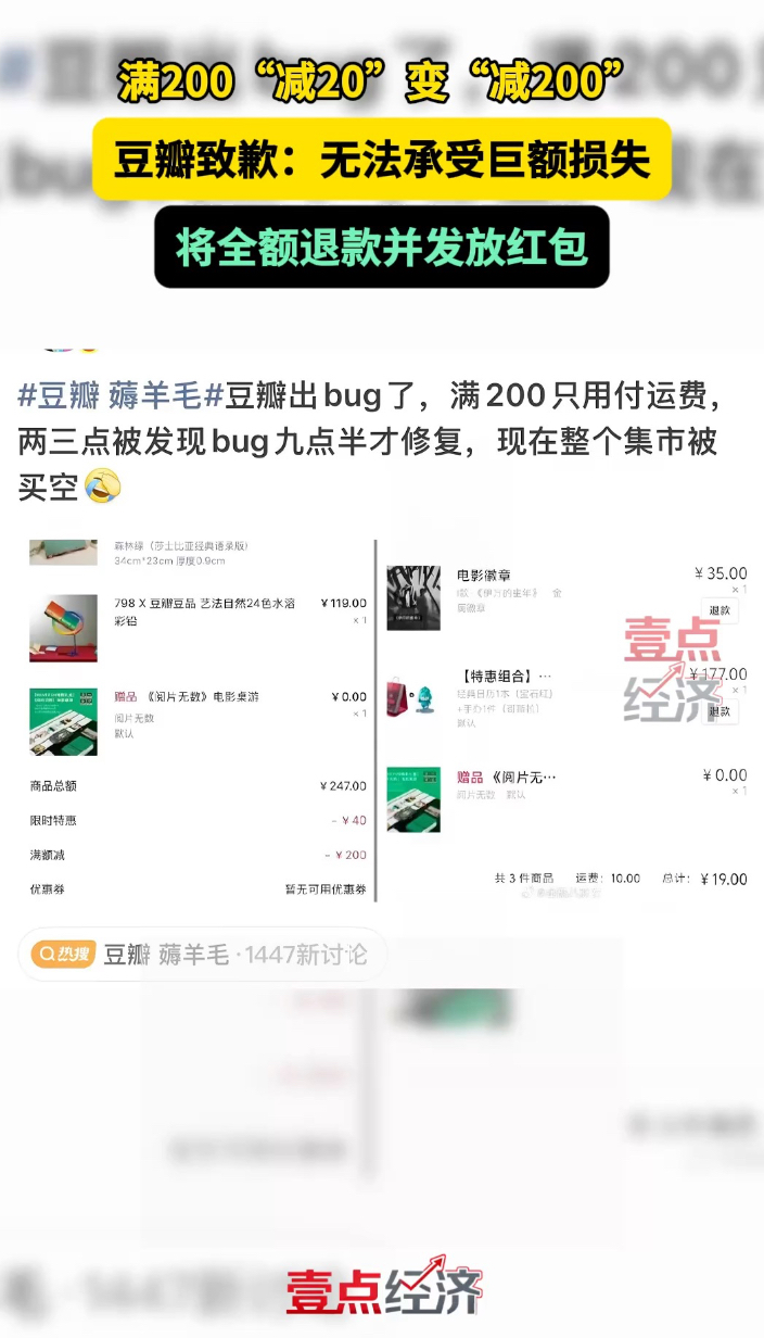 壹点企讯|错发“满200减200”优惠券,豆瓣致歉并全额退款