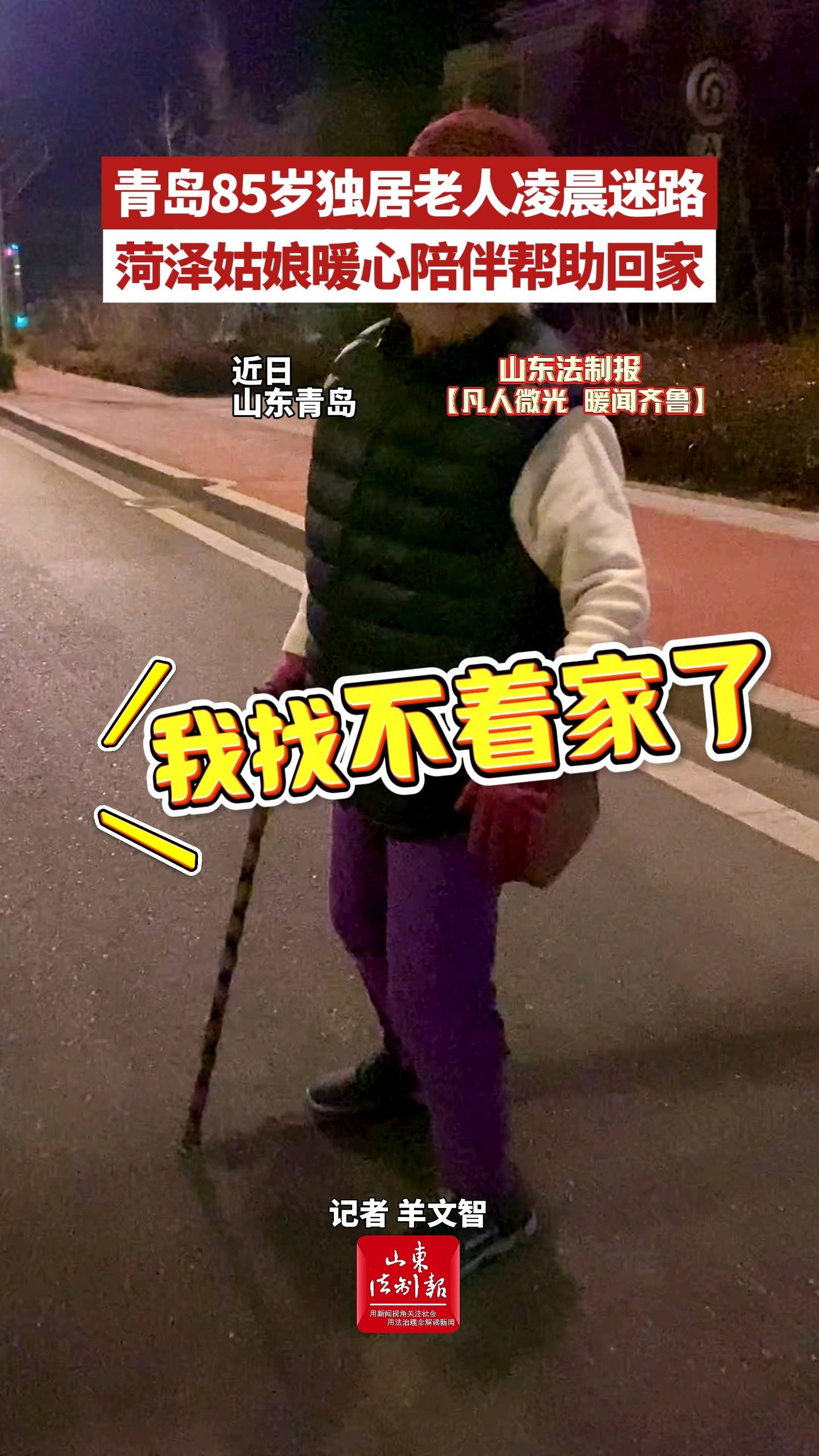 青岛85岁独居老人凌晨迷路,菏泽姑娘暖心陪伴帮助回家山东法制报 | 昨天22:39 原创山东法制报 微信扫码扫码下载客户端春节期间,在青岛崂山区,一名85岁独居老人凌晨迷路。长期在青岛生活的菏泽人张女士在回家途中发现后,陪伴老人并联系上其儿子,帮助老人安全回到家中。(大众新闻·山东法制报记者 羊文智)