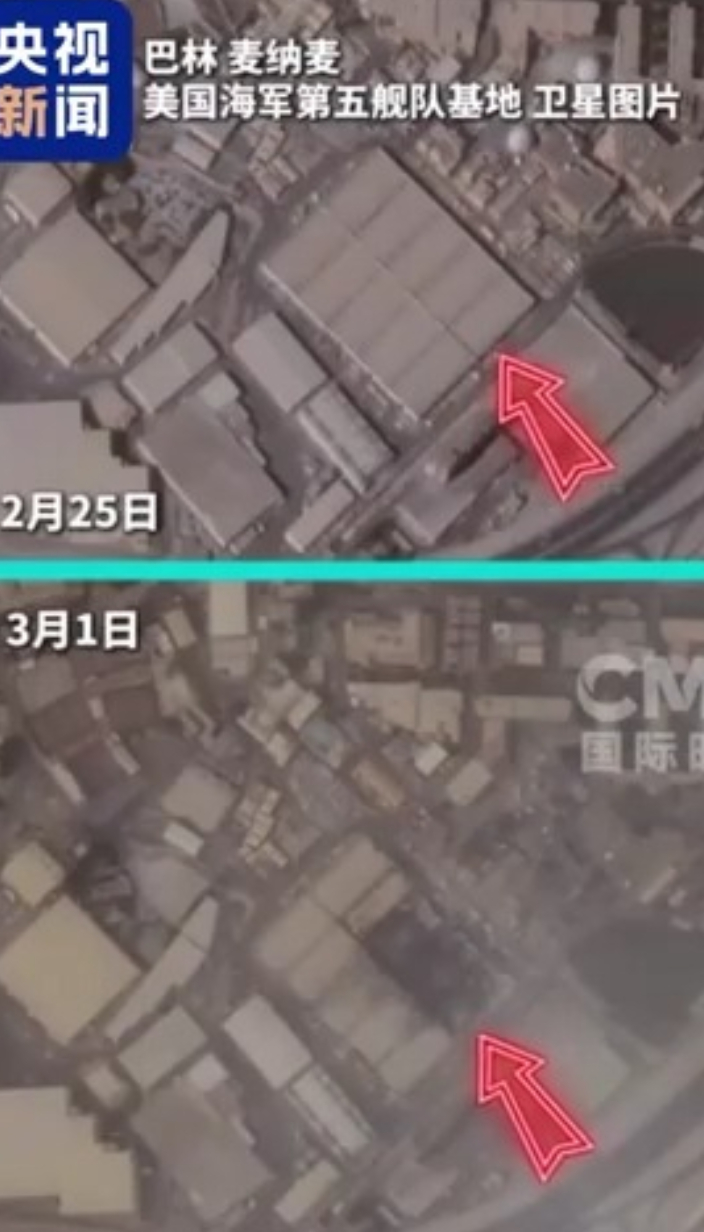 美海军第五舰队总部遇袭前后卫星对比图曝光央视新闻 18:00当地时间3月2日,位于巴林的美国海军第五舰队总部遭伊朗导弹袭击前后的卫星对比图曝光。 2月28日到3月1日,伊朗多次对巴林的美军基地发起打击,巴林首都麦纳麦上空浓烟滚滚。巴林官方证实美海军第五舰队遭袭,但具体损毁程度及伤亡情况尚未公布。 (央视新闻)