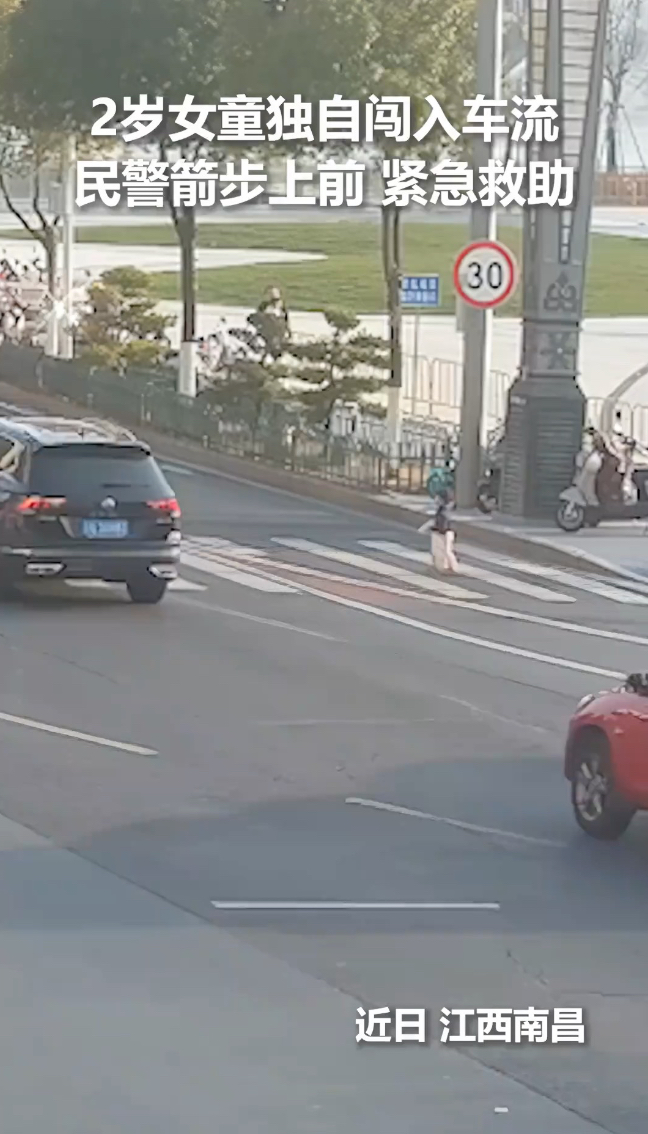 惊险一幕!2岁女童误入晚高峰车流,民警箭步上前紧急救助。家长务必看好孩子,注意安全!