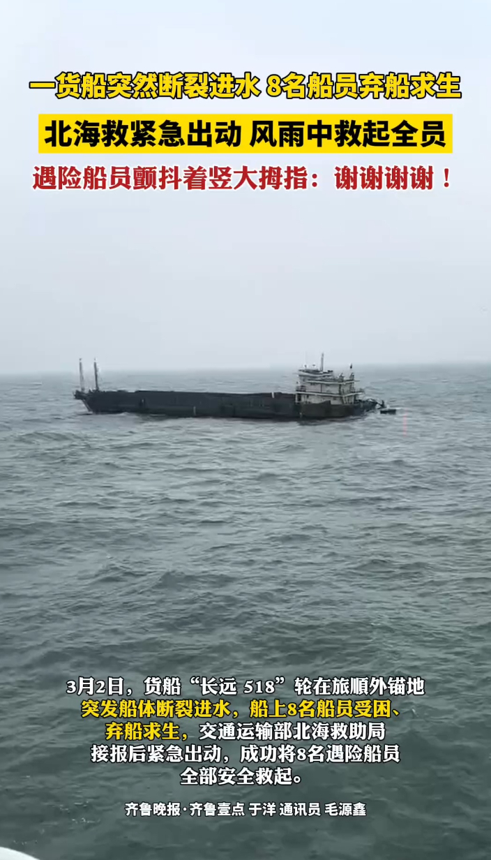 果然视频|船体断裂,8人遇险!现场画面直击惊心动魄救援时刻齐鲁晚报·齐鲁壹点客户端 14:10原创3月2日,在旅顺外锚地,一货船突然断裂进水,8名船员弃船求生。北海救紧急出动,风雨中救起全员。现场画面还原惊心动魄的救援时刻。(齐鲁晚报·齐鲁壹点 于洋 通讯员 毛源鑫 )