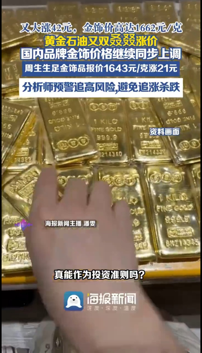 与此同时,国内品牌金饰价格继续同步上调,记者查询到,周生生足金饰品报价1643元/克,较前一日1622元/克涨21元;老庙黄金足金饰品报价1662元/克,较前一日1620元/克涨42元。