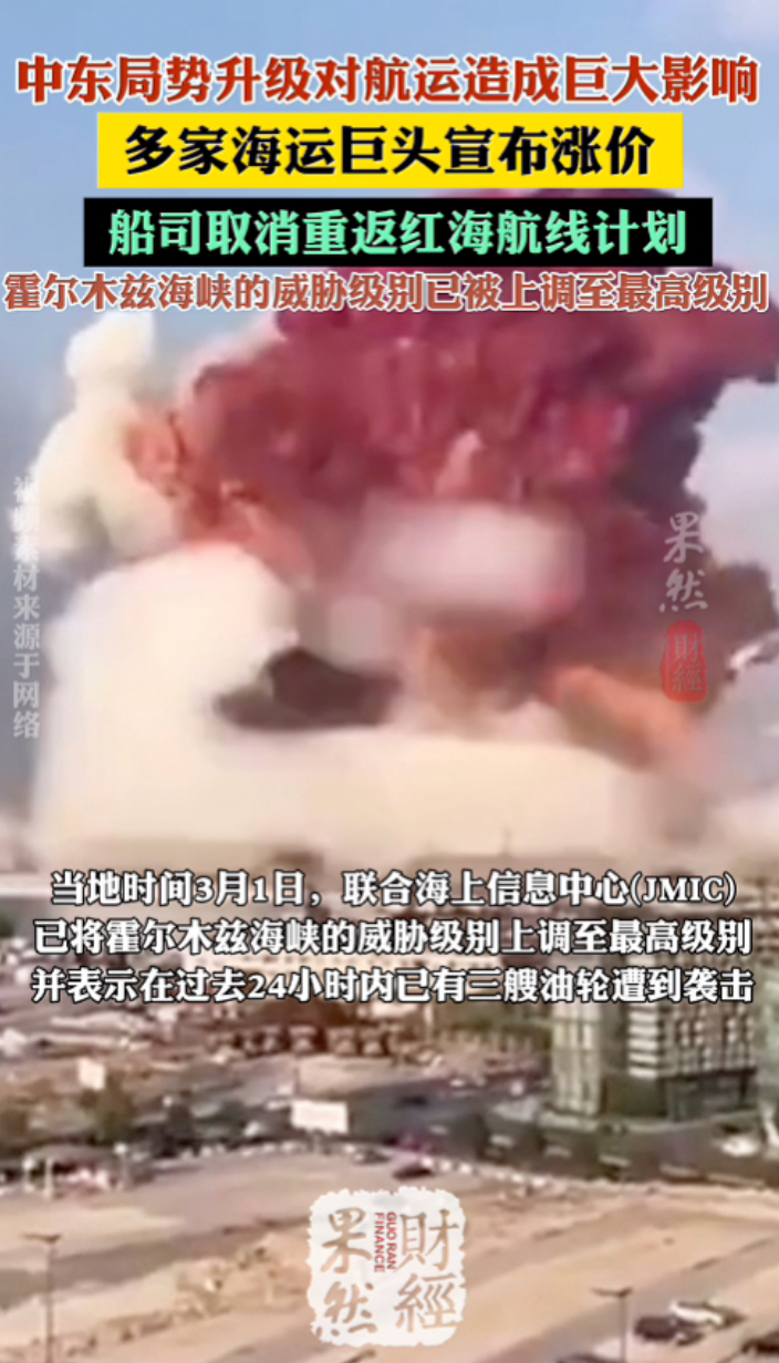 果然财经|中东局势升级!多家海运巨头宣布涨价,取消红海复航 16:57 原创齐鲁晚报·齐鲁壹点客户端 微信扫码扫码下载客户端当地时间3月1日,联合海上信息中心(JMIC)已将霍尔木兹海峡的威胁级别上调至最高级别,并表示在过去24小时内已有三艘油轮遭到袭击。据21世纪经济报道,国际油轮流量监测系统数据显示,当地时间2月28日,位于霍尔木兹海峡周边海域的油轮航行速度已普遍降至零,该地区的航运已陷入停滞状态。
