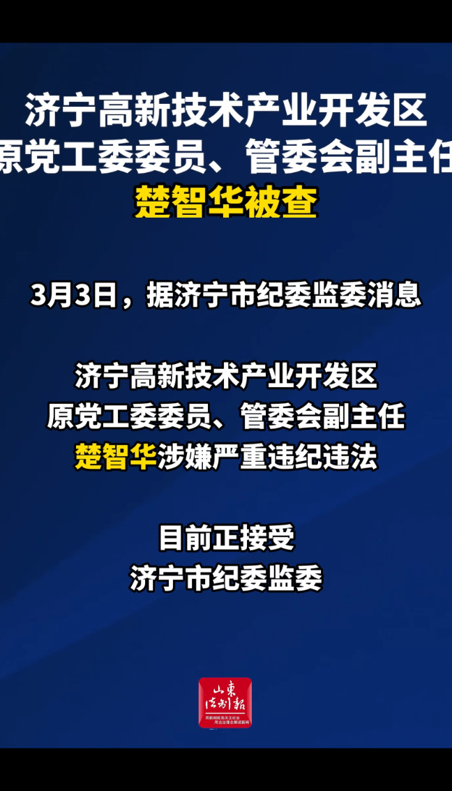 济宁高新技术产业开发区原党工委委员、管委会副主任楚智华被查 20:23 山东省纪委监委网站 微信扫码扫码下载客户端3月3日,据济宁市纪委监委消息:济宁高新技术产业开发区原党工委委员、管委会副主任楚智华涉嫌严重违纪违法,目前正接受济宁市纪委监委纪律审查和监察调查。