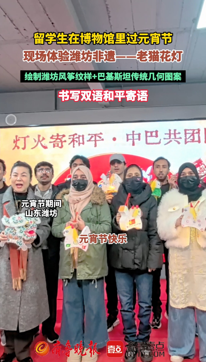 网络中国节·元宵|画花灯、猜灯谜,留学生在潍坊欢庆元宵节齐鲁晚报·齐鲁壹点客户端 19:46原创元宵节期间,潍县西方侨民集中营旧址博物馆以“灯火映团圆 中巴话和平”为主题,携手巴基斯坦留学生开展元宵节特色活动。来自山东畜牧兽医职业学院的巴基斯坦留学生们走进博物馆,沉浸式体验中国元宵民俗,以花灯为媒、以灯谜为趣、以歌声为桥,在文化交融中共庆元宵佳节,在欢声笑语中传递和平心愿,为春日的潍坊增添了一抹别样的国际友谊色彩。 齐鲁晚报·齐鲁壹点 吴昊