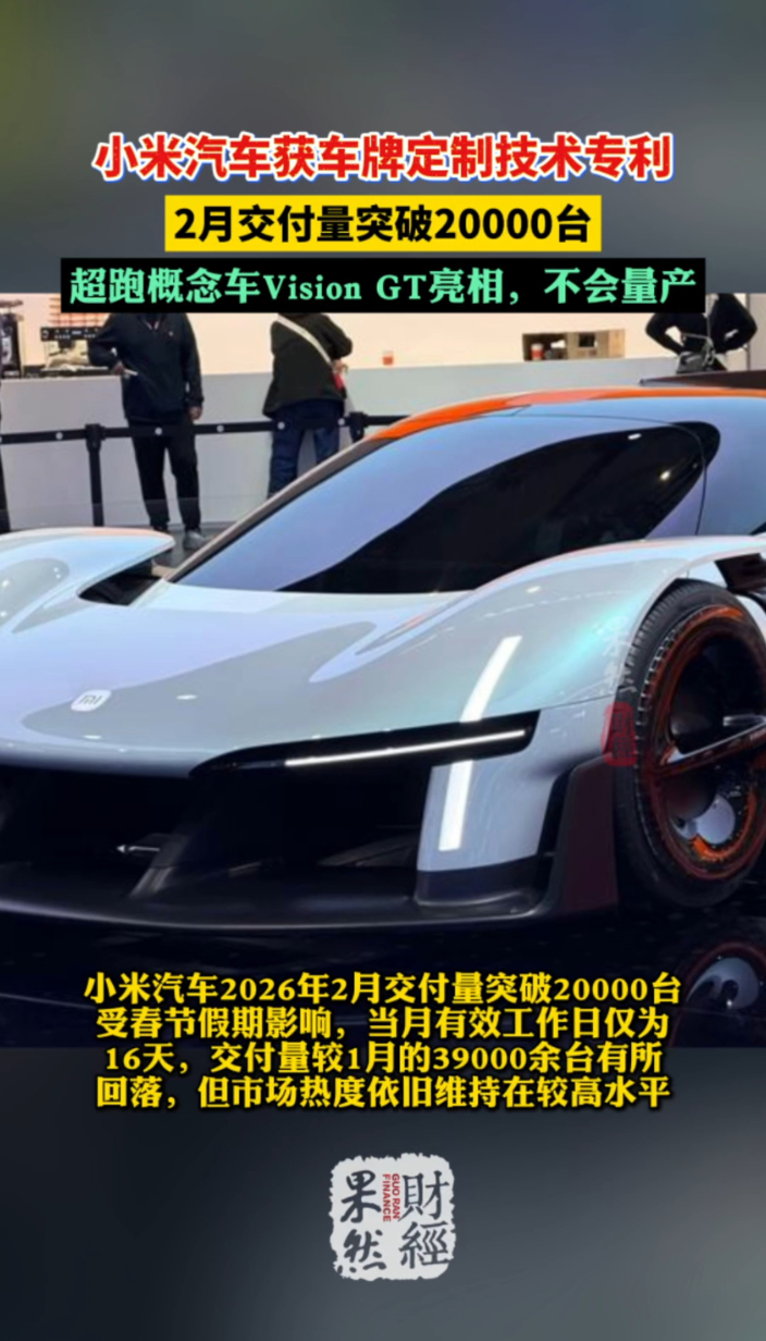 果然财经|小米超跑概念车官宣不量产!车牌定制技术专利曝光 19:58 原创齐鲁晚报·齐鲁壹点客户端 微信扫码扫码下载客户端近日,小米汽车公布车牌定制技术专利,可在智能座舱生成个性化虚拟车牌。3日,在世界移动通信大会(MWC)上,小米 Vision Gran Turismo 概念超跑亮相,主打极致空气动力学性能,官方明确不量产,仅作前瞻技术展示。此外,小米汽车 2026 年 2 月交付量突破 20000 台。