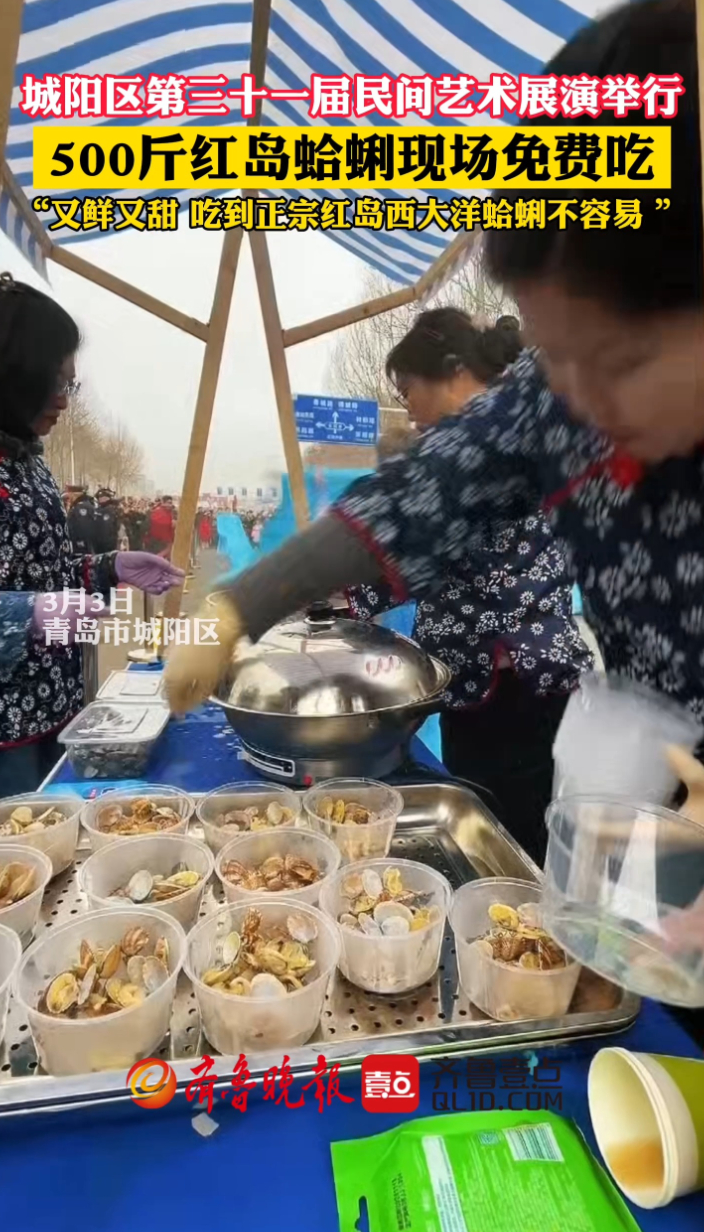 果然视频|城阳民间艺术展演举行,500斤蛤蜊现场免费吃!齐鲁晚报·齐鲁壹点客户端 09:54原创3月3日,“骏马迎春 福满城阳”城阳区第三十一届民间艺术展演在正阳中路举行。红岛街道西大洋社区带来了500斤正宗红岛蛤蜊,免费提供给现场观众。 (齐鲁晚报· 齐鲁壹点 李自强 通讯员 徐敏)