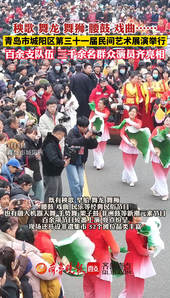 果然视频丨三千多名群众演员齐亮相!城阳区民间艺术展演举行齐鲁晚报·齐鲁壹点客户端 09:54原创3月3日上午,“骏马迎春 福满城阳”城阳区第三十一届民间艺术展演在正阳中路隆重举行。展演现场气势恢宏、热闹非凡。来自全区各街道的100余支社区文化队伍,3000余名群众演员盛装集结、依次亮相。既有经典民俗节目,也有融入机器人舞、手势舞、架子鼓、非洲鼓等新潮元素节目,百余项节目轮番上演、亮点纷呈。 (齐鲁晚报· 齐鲁壹点 李自强)