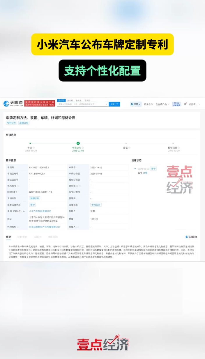 壹点企讯|小米汽车公布车牌定制专利,支持个性化配置齐鲁壹点 | 10:42 大众报业·齐鲁壹点 微信扫码扫码下载客户端天眼查知识产权信息显示,近日,小米汽车科技有限公司申请的“车牌定制方法、装置、车辆、终端和存储介质”专利公布。