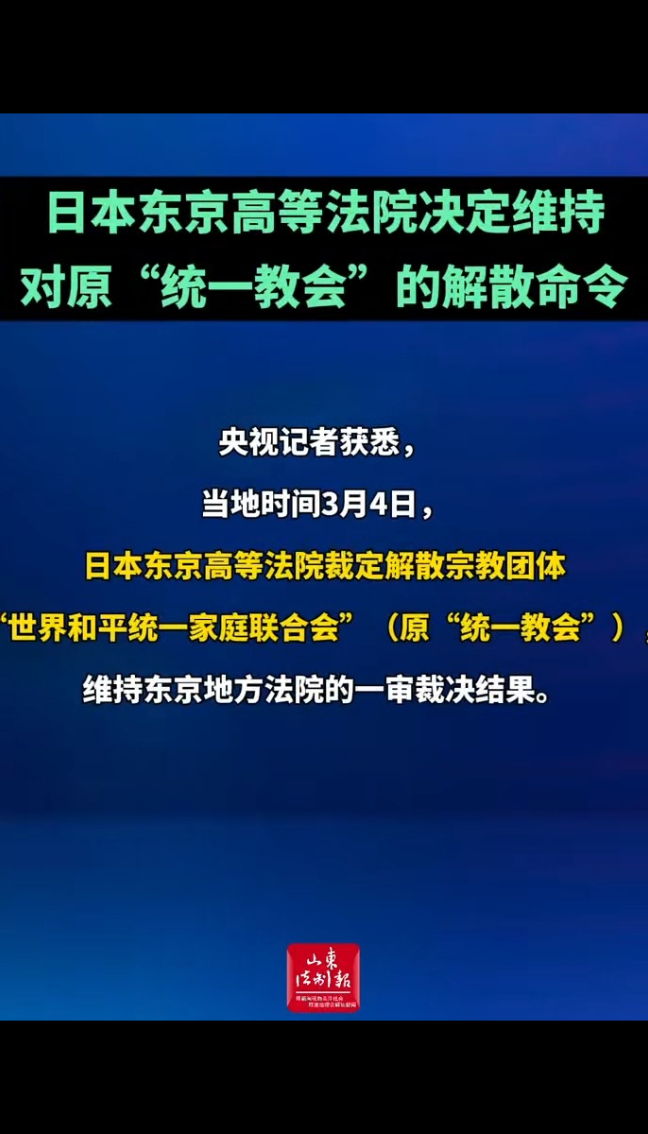 日本东京高等法院决定维持对原“统一教会”的解散命令 17:30 现场央视新闻 微信扫码扫码下载客户端央视记者获悉,当地时间3月4日,日本东京高等法院裁定解散宗教团体“世界和平统一家庭联合会”(原“统一教会”),维持东京地方法院的一审裁决结果。“世界和平统一家庭联合会”(原“统一教会”)长期胁迫信徒高额捐款问题因2022年7月前首相安倍晋三遇刺事件而引发社会关注。安倍遇刺案被告山上彻也供认,他的母亲受该教会洗脑,将几乎全部家当供奉教会,他为报复而刺杀与该教关系密切的安倍晋三。