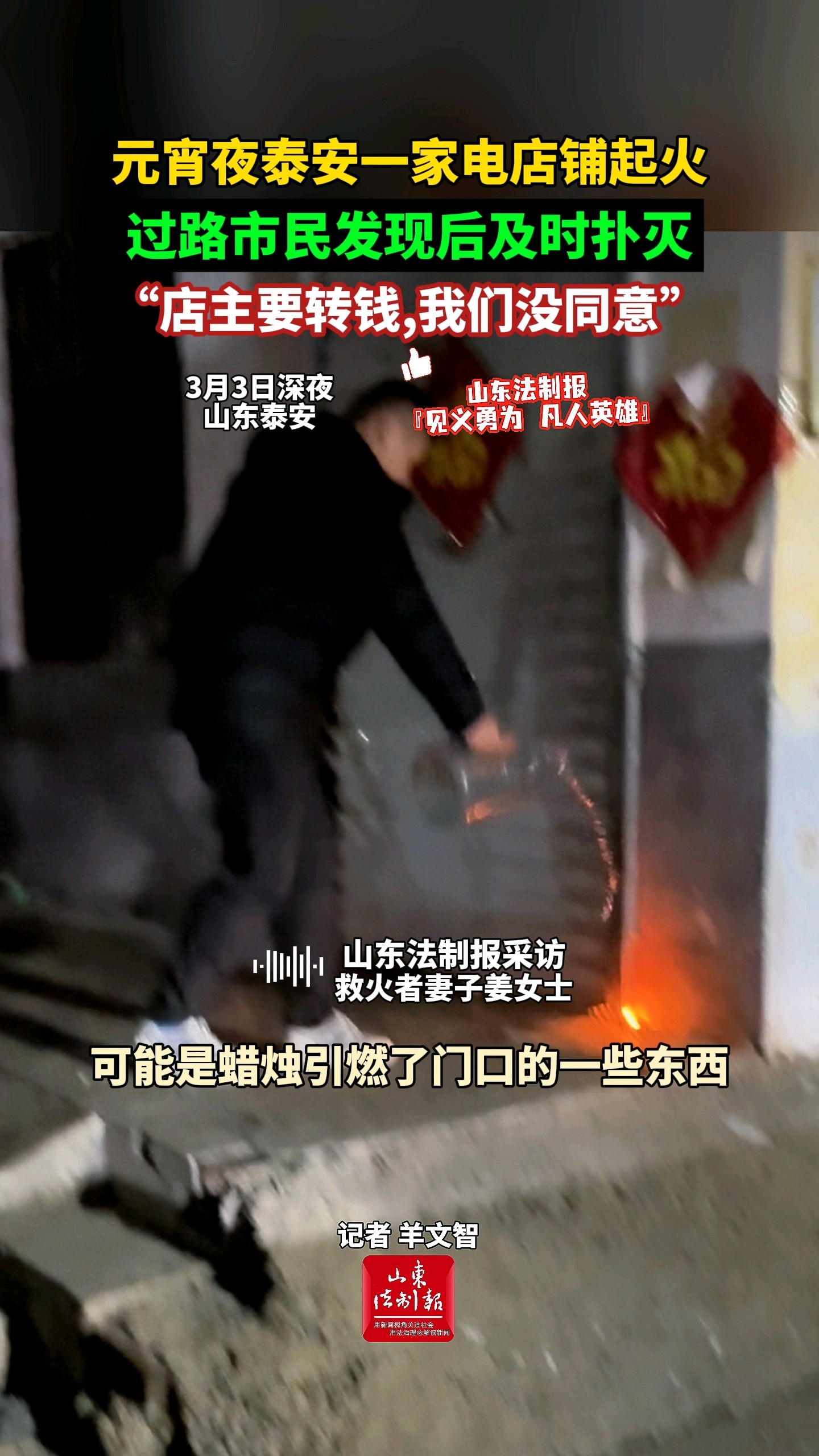 元宵夜泰安一家电店铺起火,过路市民发现后及时扑灭,“店主要转钱,我们没同意” 03-04 原创山东法制报 微信扫码扫码下载客户端3月3日深夜,泰安泰山区一家电店铺突发火情,疑似门口元宵节祈福蜡烛引燃所致。开车经过的市民黄先生发现后,果断停车,用车内携带的三桶饮用水及时将火扑灭。店主赶来后转账感谢,被黄先生一家婉拒。(大众新闻·山东法制报记者 羊文智)