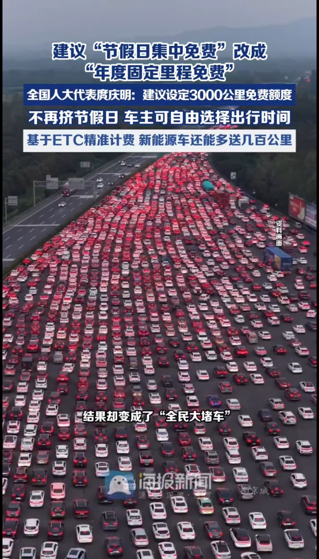 节假日高速免费,初衷是惠民,结果变成了“全民大堵车”。今年全国两会,全国人大代表、四川省雅安市教育考试院院长庹庆明带来一份重磅建议——把现行的“节假日集中免费”,改成“年度固定里程免费”,设定全国统一的年度免费通行里程为3000公里,依托全国ETC联网系统进行自动扣减,当年有效,不结转至次年。