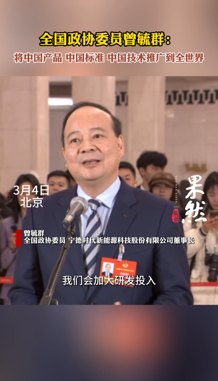 两会声音|全国政协委员曾毓群:将中国产品、中国标准、中国技术推广到全世界齐鲁晚报·齐鲁壹点客户端 16:51原创全国政协委员、宁德时代新能源科技股份有限公司董事长曾毓群在接受记者采访时表示,未来将会加大研发投入,会应用更多人工智能的方式,“我们将会把中国的产品卖到世界,把我们的技术、我们的标准推广到全世界。” (齐鲁晚报·齐鲁壹点 刘志坤 鹿青松)