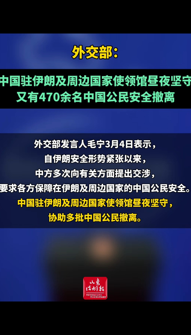 外交部发言人毛宁3月4日表示,自伊朗安全形势紧张以来,中方多次向有关方面提出交涉,要求各方保障在伊朗及周边国家的中国公民安全。中国驻伊朗及周边国家使领馆昼夜坚守,协助多批中国公民撤离。战事爆发后,又有470余名中国公民在中国驻伊朗使领馆的组织下安全撤离。考虑到伊朗当前严峻的安全形势,我们再次郑重提醒在伊朗的中国公民加强自身防范,尽快安全撤离,及时向驻伊朗使领馆报备信息。