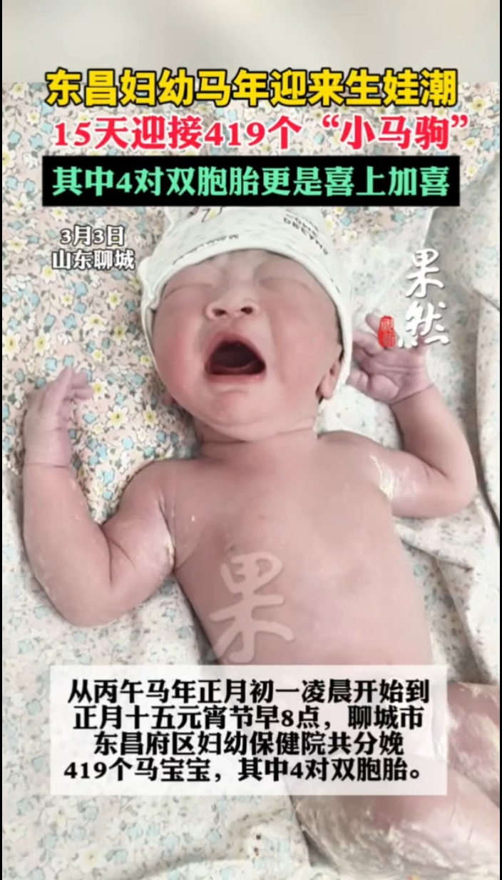 东昌妇幼马年迎来生娃潮,15天迎接419个“小马驹”大众报业·齐鲁壹点 17:14从丙午马年正月初一凌晨开始到正月十五元宵节上午8时,聊城市东昌府区妇幼保健院共分娩419个马宝宝,其中4对双胞胎。(齐鲁晚报·齐鲁壹点 国晓宁)