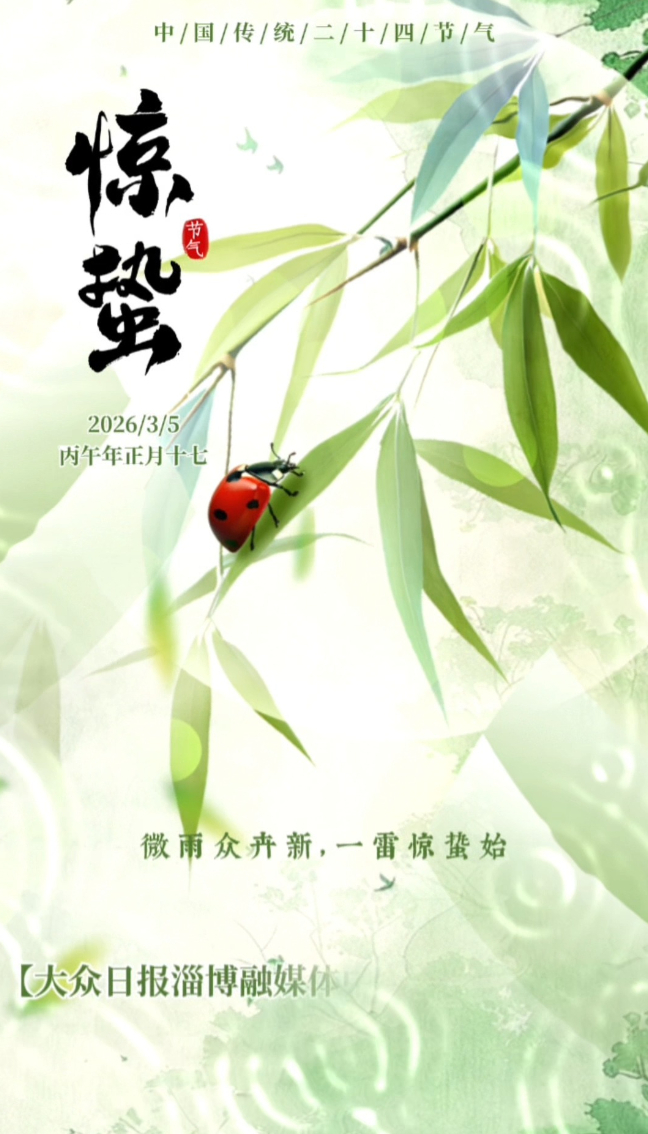 小记者说节气——惊蛰 07:00 原创大众新闻·鲁中晨报 微信扫码扫码下载客户端“微雨众卉新,一雷惊蛰始”,惊雷破冻土,虫鸣醒春深。阳气升腾间,万物挣脱桎梏,尽显生机。人生亦需这般勇气,打破迷茫、突破局限,愿你不负春光,不负自己。(大众新闻·鲁中晨报记者 周文慧)