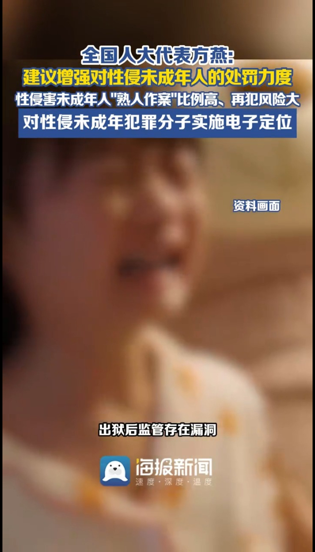 全国人大代表方燕强烈呼吁:加大惩处性侵未成年人犯罪力度!数据显示,这类案件熟人作案比例高、再犯风险极大,现行处罚力度不够,出狱后监管存在漏洞。