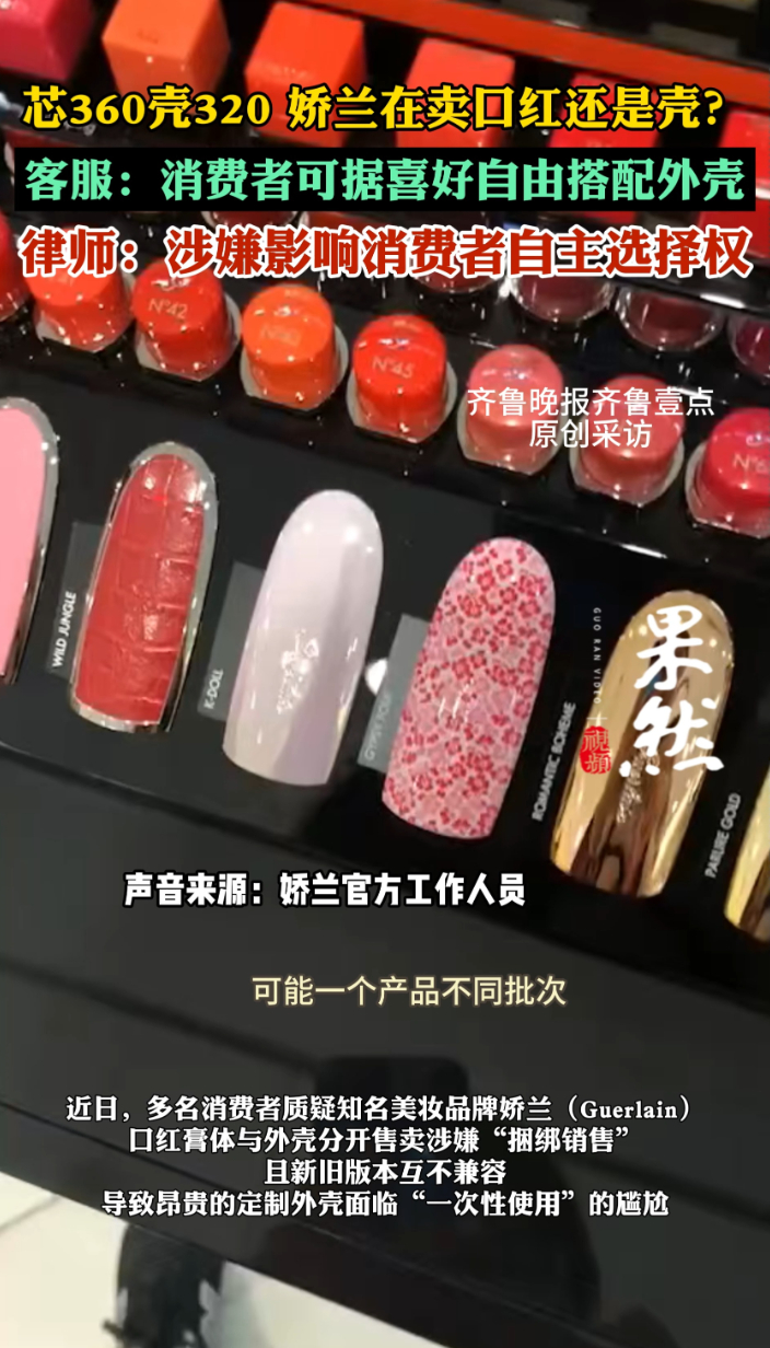 果然视频|口红也搞“配货”?娇兰:不仅芯要换,壳还得单算齐鲁晚报·齐鲁壹点客户端 20:16原创近日,多名消费者质疑知名美妆品牌娇兰(Guerlain)口红膏体与外壳分开售卖涉嫌捆绑销售,且新旧版本互不兼容,导致昂贵的定制外壳面临“一次性使用”的尴尬。法律界人士指出,此类模式或涉嫌侵犯消费者的自主选择权。(线索电话:0531-85193656;邮箱:405617016@qq.com)(齐鲁晚报·齐鲁壹点 李苗 鲁畅)