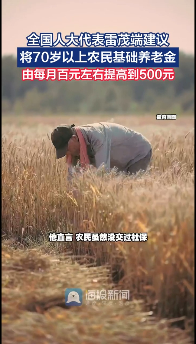 全国人大代表雷茂端建议将70岁以上农民基础养老金从百元左右提高至500元。