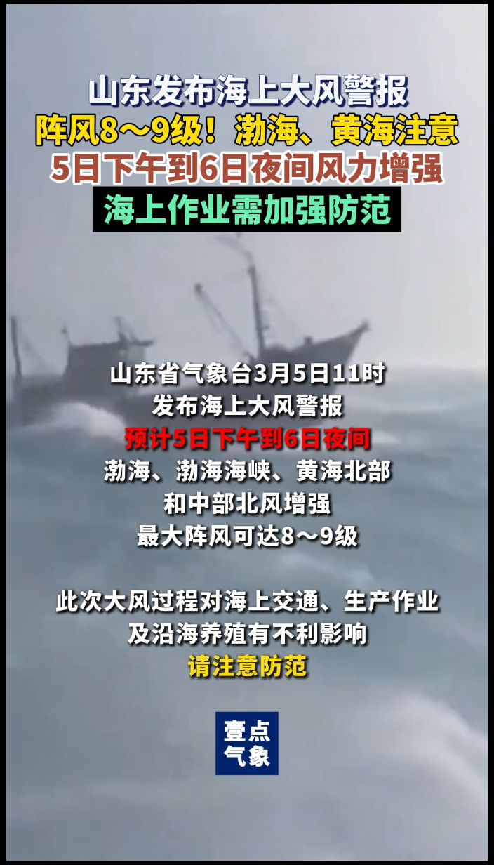 壹点气象|山东发布海上大风警报,局部阵风8~9级大众报业·齐鲁壹点 15:29山东省气象台3月5日11时发布海上大风警报:预计5日下午到6日夜间,渤海、渤海海峡、黄海北部和中部北风增强,最大阵风可达8~9级。此次大风过程对海上交通、生产作业及沿海养殖有不利影响,请注意防范。