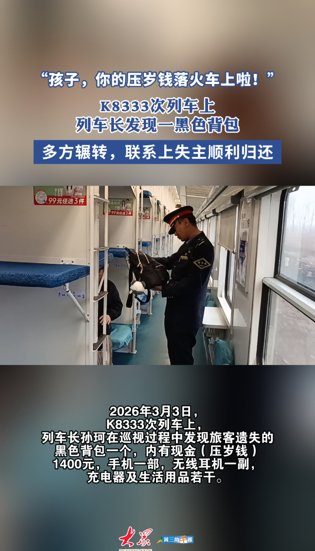 2026年3月3日,管内车队东菏三组值乘的K8333次列车,列车长孙珂在巡视过程中发现旅客遗失的黑色背包一个,内有现金(压岁钱)1400元,手机一部,无线耳机一副,充电器及生活用品若干。出于职业的敏感性,孙珂感觉这是一位未成年人在乘车过程中遗失的,后经多方查找,得到了该旅客的联系方式,并与旅客取得联系,告知旅客遗失物品已妥善保管,平复旅客焦急心情。列车长通过联系得知旅客系东营人,后将该旅客遗失物品妥善送至东营站办理交接,物归原主。旅客表示感谢。(大众新闻记者 李小凡)