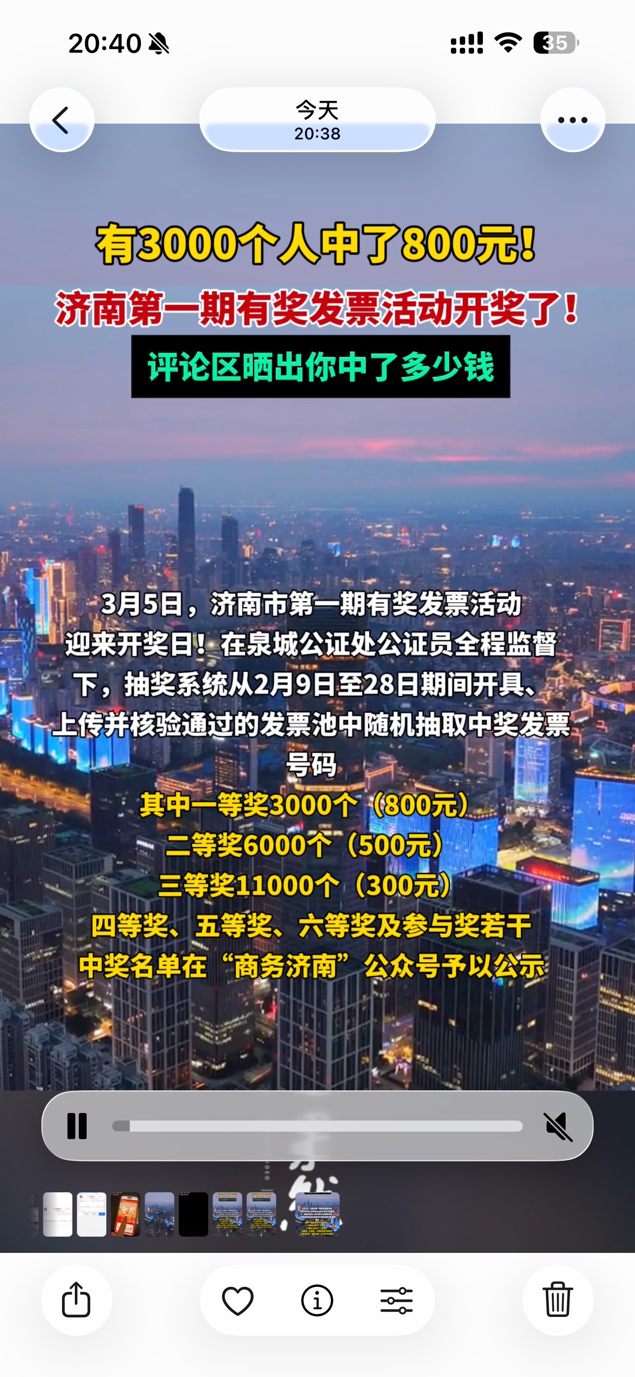 果然视频|有3000人中了800元,济南首期有奖发票活动开奖齐鲁晚报·齐鲁壹点客户端 09:46原创3月5日,济南市第一期有奖发票活动迎来开奖日!在泉城公证处公证员全程监督 下,抽奖系统从2月9日至28日期间开具、 上传并核验通过的发票池中随机抽取中奖发票 号码。其中一等奖3000个(800元)二等奖6000个(500元)三等奖11000个(300元) 四等奖、五等奖、六等奖及参与奖若干, 中奖名单在“商务济南”公众号予以公示。